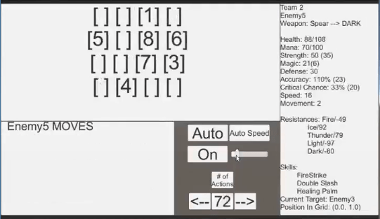 At this point I knew it all worked: Enemies would populate the “battlefield”, all of their stats would be randomized, and they has skills (I REALLY wanted to add skills). This is where the next problem occurred, I didn’t know how to program AI movement. I did not even know where to start, so I just improvised. I gave every enemy a target that they wanted to kill, that would change whenever their target was dead, and they would “move” towards their target with a hodge-podge series of if/else statements. And it worked for the most part. I would run into some null end states (enemies not moving towards each other, or they would only move and never attack) but nothing game crashing. So in the end, to test AI and to try to understand more how data works with no 3D elements, I learned a lot. This is what I got out of it:
