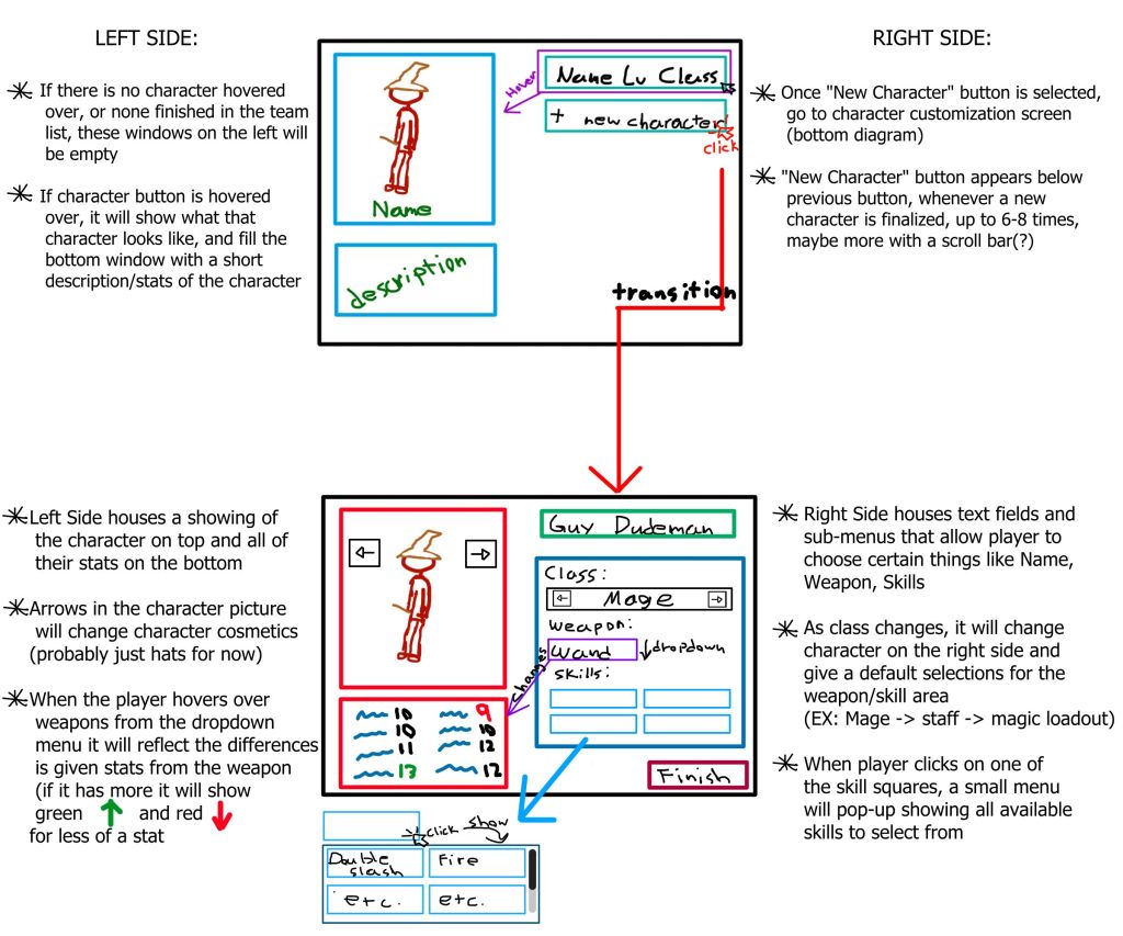 If there were things that I would have liked to implement it would definitely be a better Character Selection screen. I feel like it should be more of a Character Customization screen, with more options and better layout. a design I had below: